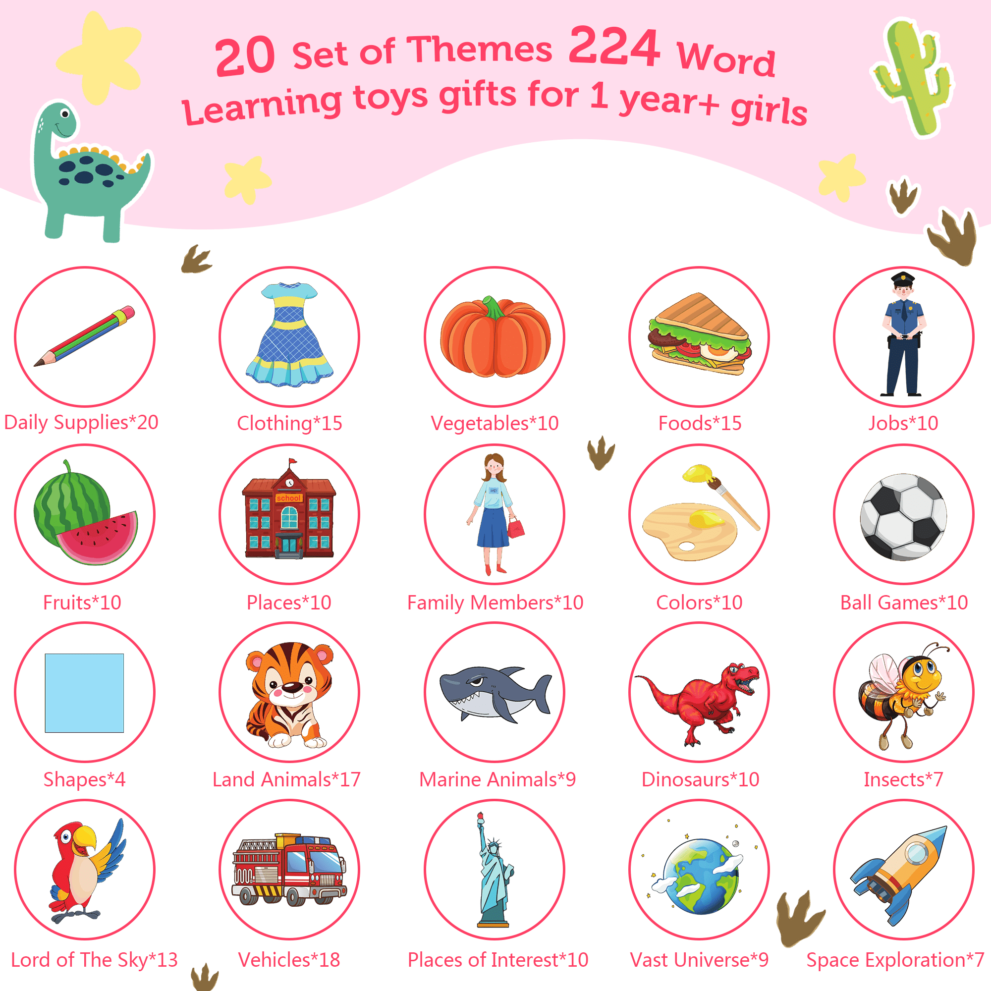 🔤 Version améliorée de 234 mots fréquents : comprend 117 cartes flash recto-verso sur le thème des dinosaures avec reconnaissance de QR code . Le lecteur de cartes lit chaque mot à voix haute 🗣️ et le répète lorsqu’on appuie sur le bouton. Les tout-petits peuvent explorer les aliments, les couleurs, les noms et les cris des animaux, et bien plus encore , développant ainsi leurs capacités cognitives et auditives 🧠👂 .